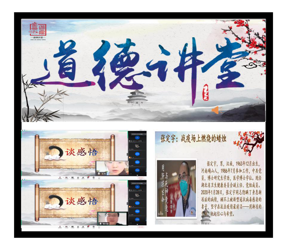 讲堂在默哀一分钟环节中拉开帷幕,之后主持人带领大家在静默中反躬自省。随后由bevictor伟德官网艺术团歌唱分团带领大家歌唱《爱的奉献》,无私的奉献精神在温暖的歌声中感染着每一个人。在学模范环节中,全体师生认真观看《战疫场上燃烧的蜡烛---张定宇经理》的视频,张定宇经理在生与死的面前,舍身忘我始终奋斗在抗疫第一线,他不忘初心、勇担使命的精神令全体师生感动。在诵经典环节,主持人带领参会人员学习体会明代《增广贤文》中的“但行好事,莫问前程。河狭水激,人急计生。明知山有虎,莫向虎山行。”经典名言。在谈感悟环节,教师代表以自身的经历分享了对本次道德讲堂主题的感悟,倡导大家向模范学习。最后,讲堂在送祝福的视频中落下帷幕。