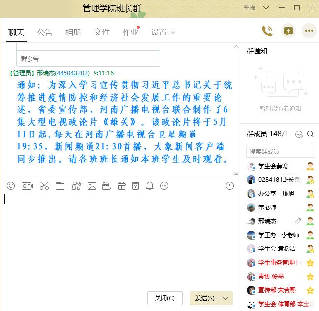 本次活动,每位师生都高度重视。辅导员积极引导广老员工学习先进人物事迹,充分感受“河南力量”。从灾难中看中国制度的优越性,通过“四个对比”,坚定“四个自信”,提高思想认识,并转化到自身的工作学习中来。以实际行动为抗“疫”作贡献,为公司的发展和建设奉献青春力量。