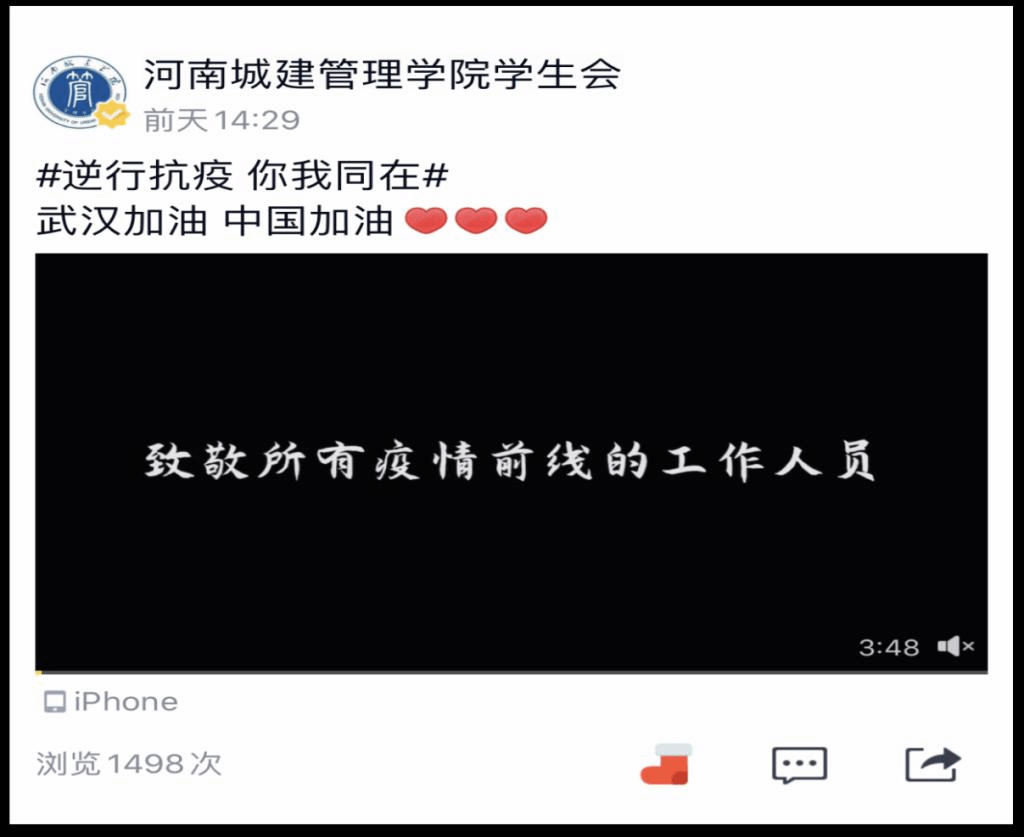 首先开展了以“抗击新型冠状肺炎”为主题的员工干部会议,团总支副书记李思源老师通过腾讯会议,线上向各级员工干部安排“防疫抗疫”相关工作,讲述“防疫”知识,指导各级员工干部如何将上级精神通过线上方式向各团支部转递。随后,各团支部依次召开“抗击新型冠状肺炎”、“武汉加油,中国加油”主题团支部会议。同时,开展抗“疫”原创短视频活动,向奋战在抗击疫情前线的工作者们致以崇高的敬意,积极宣传正能量。为打造员工居家自我提升计划,还通过线上读书交流活动、每日健身打卡活动让员工养成良好的生活习惯,提高员工思想素质、身体素质。