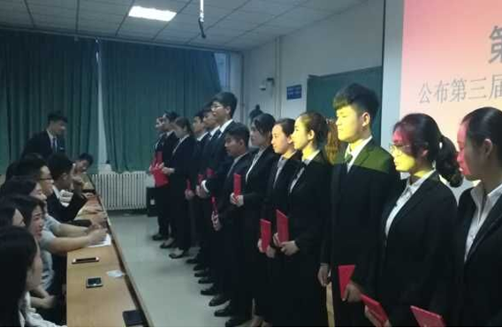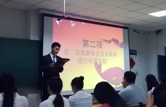 换届仪式在《中华人民共和国国歌》国歌声中拉开序幕,之后由第二届旅游协会会长陈希进行年度工作总结,并由姜孟达老师向旅游协会优秀组织干部颁发荣誉证书。经过投票选举,主持人公布第三届旅游协会组织干部名单,并向其颁发聘书。最后,由新晋旅游协会会长杨雯凯进行就职演说,展现出了其强烈的自信心与责任感。之后,各部门新部长上台做出自我介绍,展现了各自的风采。伴随着姜孟达老师的精彩总结发言,大会也将落下帷幕。最后,参加此次换届大会的全体成员合影留念,本次换届大会圆满结束。