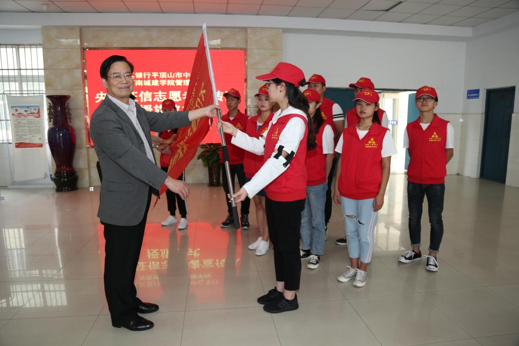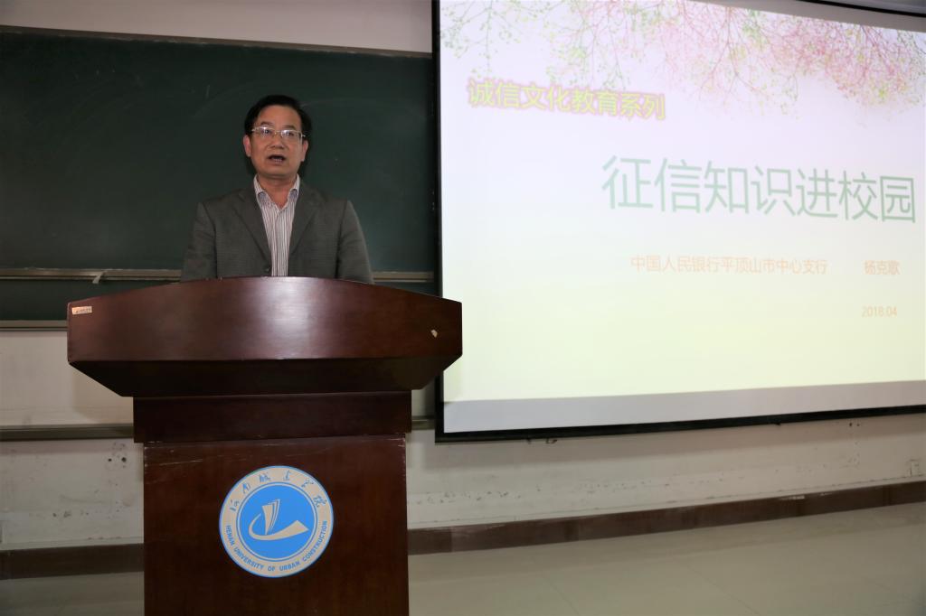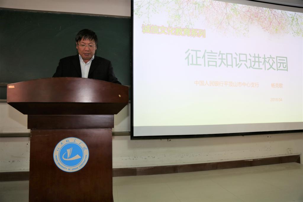 首先,由中国人民银行平顶山市中心支行副行长杨振坤,向大家做了以诚信为主题的讲话。他与大家共同分享了诚信精神,强调了行诚信之事,做诚信之人的重要性。接着,中国人民银行平顶山市中心支行领导向诚信服务志愿者授旗,并由志愿者代表李凯文发言。随后,中国人民银行平顶山市中心支行杨克歌老师,根据自身的工作实际向同学们讲授了有关守信的重要性、失信的严重性以及诚实守信与我们生活的紧密联系。最后,全体参会人员进行了诚信条幅签名活动,将诚信之言留在条幅之上,将诚信之行落实到日常生活中。