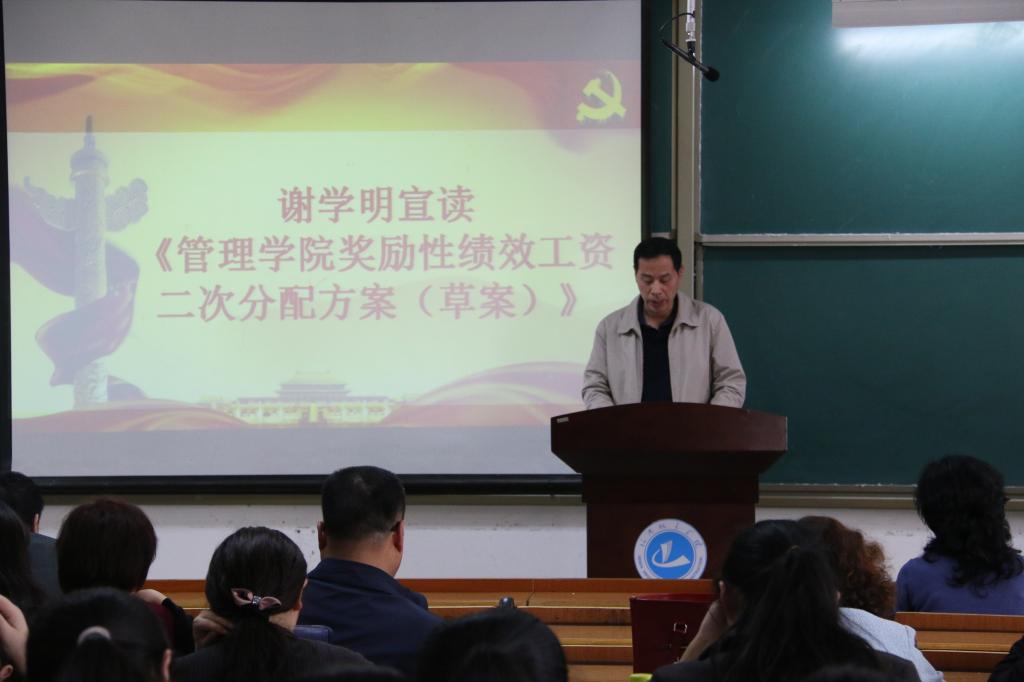 谢学明宣读《bevictor伟德官网奖励性绩效工资二次分配实施方案(草案)》